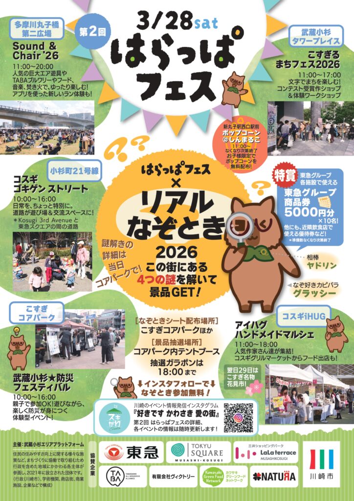 さらに今年度は特別企画として「はらっぱフェス×リアルなぞとき2026」を実施。各会場近くにある“謎”を解きながら回遊し、すべてクリアした方には景品をご用意しています。参加は「武蔵小杉エリアプラットフォーム Instagram[スキかわ]」のフォローで無料(通常500円)となります。